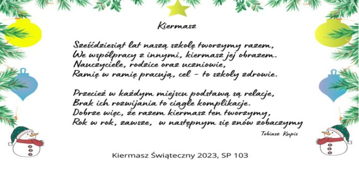 Tradycyjnie już w grudniu serdecznie zapraszamy rodziców, uczniów oraz pracowników naszej szkoły na Rodzinny Kiermasz Świąteczny, który odbędzie się w Szkole Podstawowej nr 103, w...
