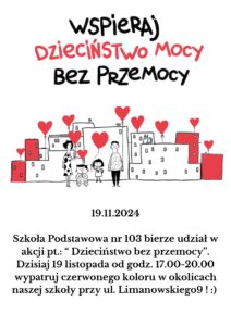Szkoła Podstawowa nr 103 z dumą uczestniczy w inicjatywie „Dzieciństwo bez przemocy”, która ma na celu budowanie świadomości i promowanie wartości rodzinnych oraz bezpieczeństwa dzieci. Dnia 19 listopada, w godzinach 17:00-20:00, zapraszamy wszystkich mieszkańców do wzięcia udziału w wyjątkowym wydarzeniu. W tym czasie okolice naszej szkoły przy ul. Limanowskiego 9 zostaną oświetlone na czerwono, symbolizując jedność i wsparcie dla tej szlachetnej kampanii. Zachęcamy do przyłączenia się do nas w tym dniu, by razem stworzyć bezpieczniejsze i bardziej przyjazne środowisko dla naszych najmłodszych. To doskonała okazja, by wspólnie zamanifestować nasze zaangażowanie w walkę z przemocą wobec dzieci.