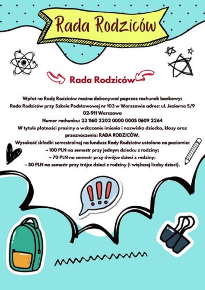 Nazwa rachunku: Rada Rodziców przy Szkole Podstawowej nr 103 w Warszawie adres: ul. Jeziorna 5/9, 02-911 Warszawa