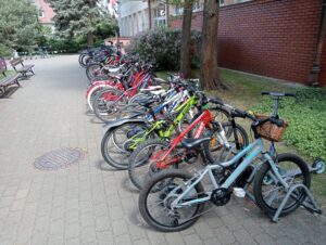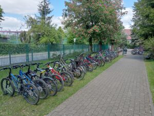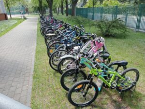 Rowerowy Maj w szkole przy ulicy Jeziornej . Wszystkie stojaki i ogrodzenie wypełnione rowerami.