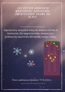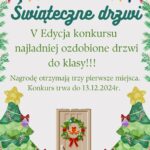 3. Warunkiem przystąpienia do konkursu jest udekorowanie drzwi do swojej klasy ozdobami świątecznymi.