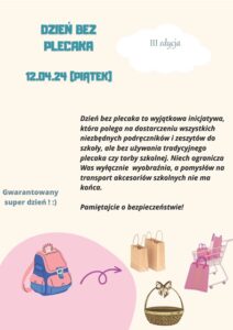 W piątek uczniowie dużej szkoły mogli zamiast plecaków przynieść potrzebne rzeczy do szkoły w czymś innym niż plecak. Dziękujemy za włączenie się do III edycji tej akcji uczniom klas: 4b, 5a, 6a, 6c, 7a, 7b i 8c 🙂